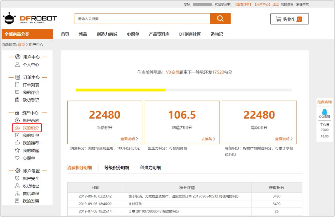 DFRobot官方商城积分有等级积分和消费积分两种类型。