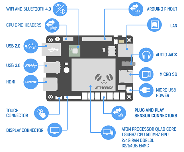 LattePanda上集成了一块Arduino Leonardo, 这意味着它可以用来控制和感知物理世界!兼容Arduino数以万计的硬件模块和软件类库。无论您是一个DIY的狂热爱好者、交互设计师还是机器人专家,LattePanda都是你理想的伙伴!