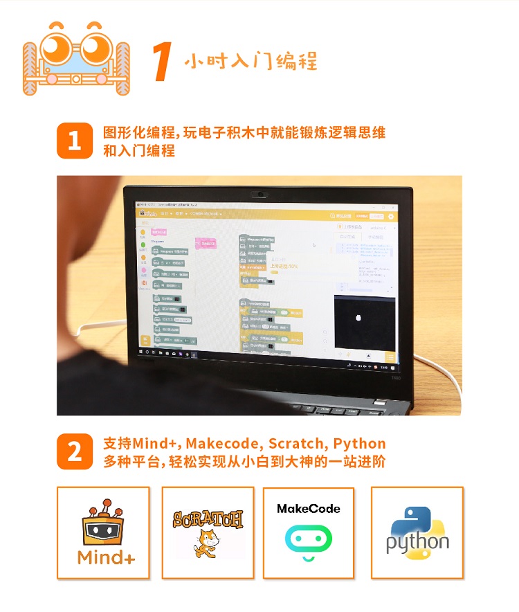 麦昆: micro:bit教育机器人V4.0是一款用于STEAM教育的易用micro:bit编程机器人,延续了micro:bit的趣味性和易操作性。这款迷你机器人以其寓教于乐的特点,让学生能够快速掌握图形编程,同时激发他们对科学和逻辑思维的兴趣。建议年龄:8 +麦昆: micro:bit教育机器人 V4.0 支持 Mind+ 编程平台。Mind+ 是 DFRobot 的图形化编程平台,支持 Python、Arduino 等多种编程语言。目前,Mind+平台广泛应用于各类传感器、模块及相关教育产品中。